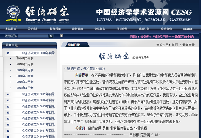 (通讯员程明梅)日前获悉,足球比分球探 田彬彬副教授与其合作者的最新研究成果《征纳合谋、寻租与企业逃税》在国内重点权威期刊《经济研究》2018年第5期上发表。