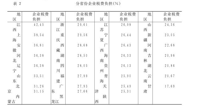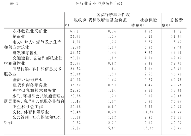 研究表明,中国企业税费负担主要来自税收负担和社会保险费负担。导致不同类型、不同行业和不同地区企业税费负担差异的主要原因,一是财政体制下的政府行为,包括税收计划的制定、税收征管和地方减税降费等行为;二是产业行业特征,行业资本有机构成比例、劳动力密集度、增值税税制下是否能够抵扣等;三是企业特征,包括企业的所有制、企业规模等特征。
