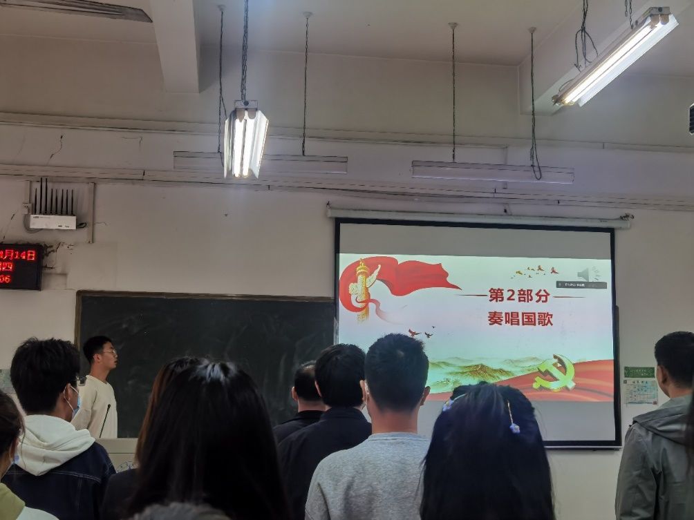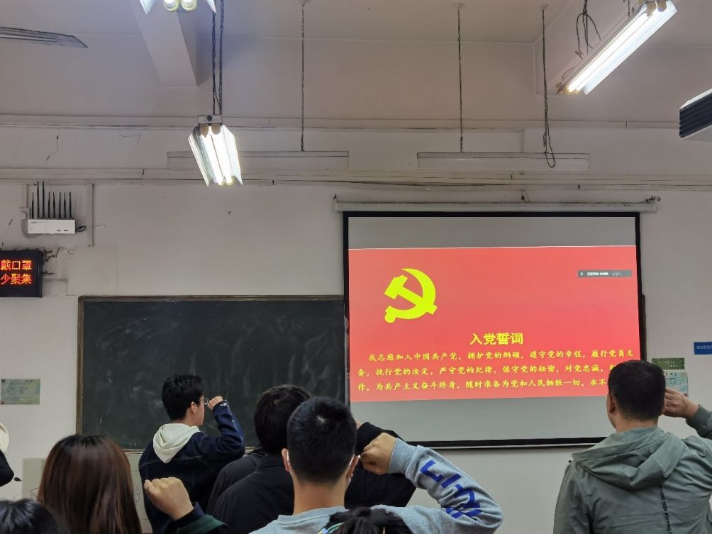 会议第二项,全体成员起立,面对党旗举起右拳,在祝东昊同志的领颂下重温入党誓词。