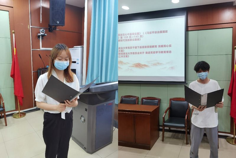 在由申有鹏同志诵读《中国共产党章程》节选后,会议进入专题学习环节,全体成员深入学习习近平总书记关于坚持以人民为中心重要论述精神以及学校党员干部下基层察民情解民忧暖民心实践活动实施方案,由曹雅琪同志和黄景鸿同志领学,其他同志参与讨论。