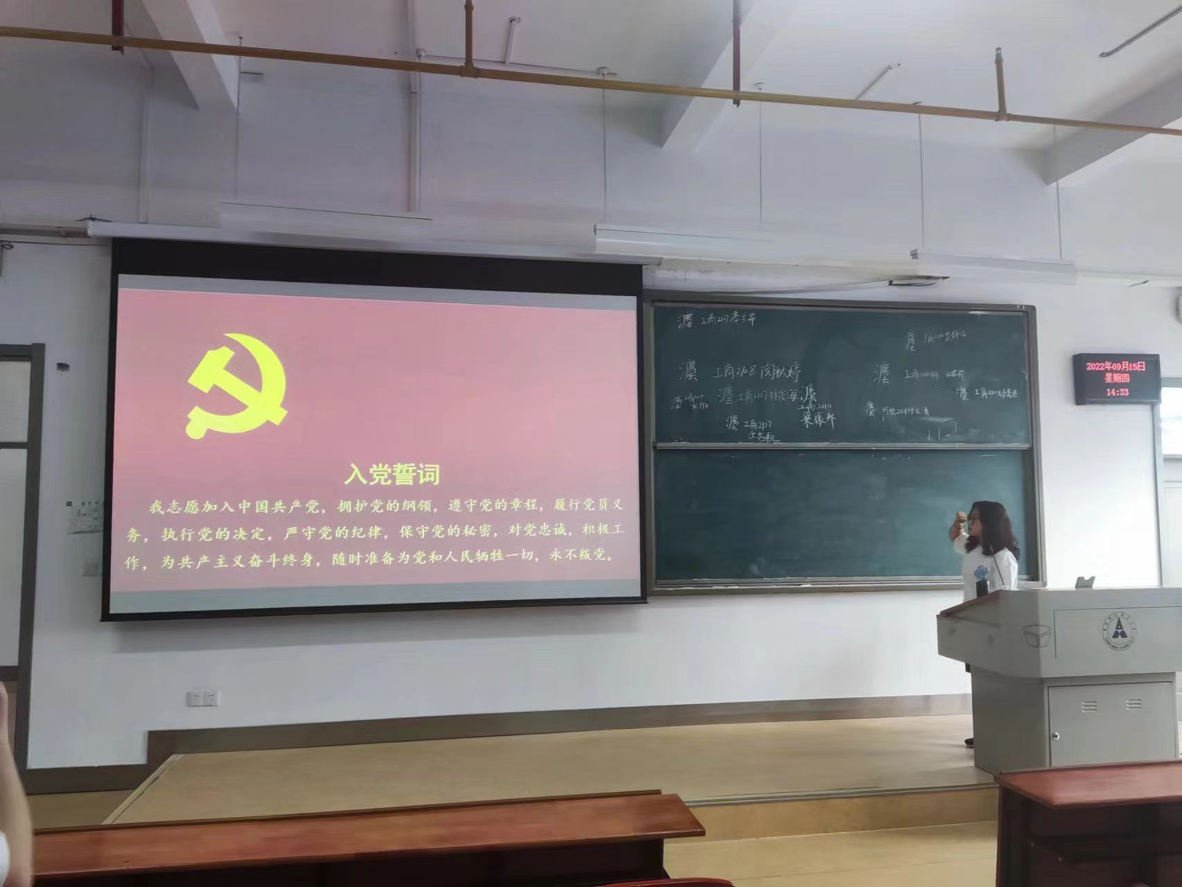 会议第二项,支部全体成员起立,面向党旗举起右拳,在钱亭熹同志的领读下重温入党誓词。全体支部成员在铿锵有力的誓词下感悟中国共产党的光辉历程,坚定为共产主义事业奋斗终身的理想信念。