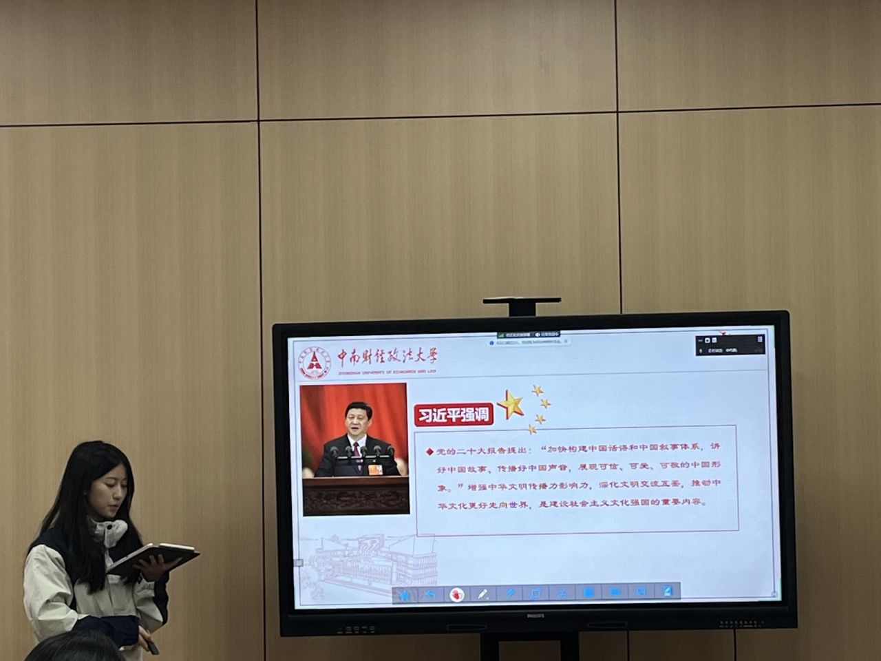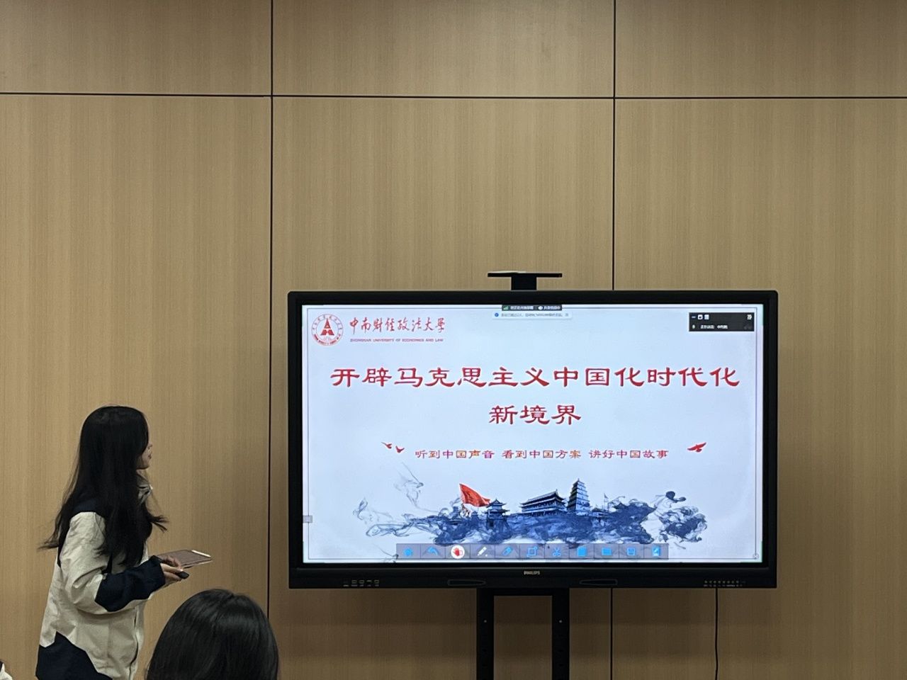 而后,由谭梦菲同志在实践行动方面就如何“开辟马克思主义中国化时代化新境界”进行讲解,主要从“为什么要讲好中国故事”、“讲好什么样的中国故事”、“怎样讲好中国故事”三个角度展开论述。