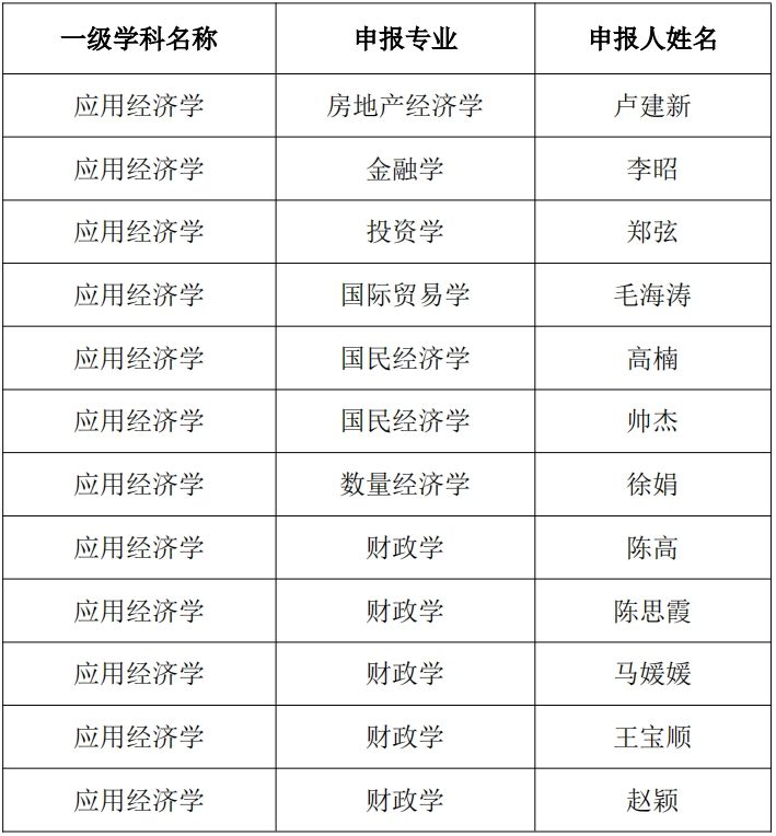 根据《关于开展2023年博导遴选一级学科评议组评议工作的通知》相关要求,应用经济学学科评议组依据《中南财经政法大学博士生导师岗位管理办法(试行)》(中南大研字〔2023〕23号)对已通过校博导遴选资格审查的申请人进行学科评议。经表决,评议组一致同意以下申请人通过学科评议: