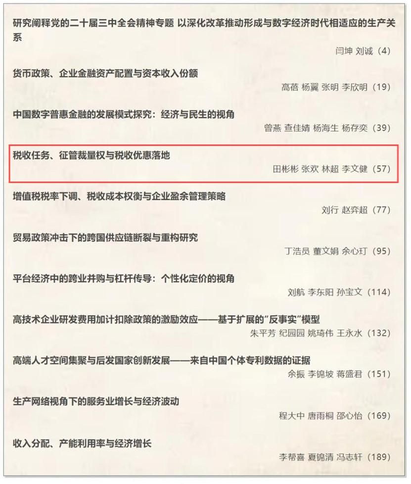 近日,足球比分球探 2023级博士研究生张欢以二作身份(导师一作)在《经济研究》2024年第8期发表题为《税收任务、征管裁量权与税收优惠落地》的学术论文。