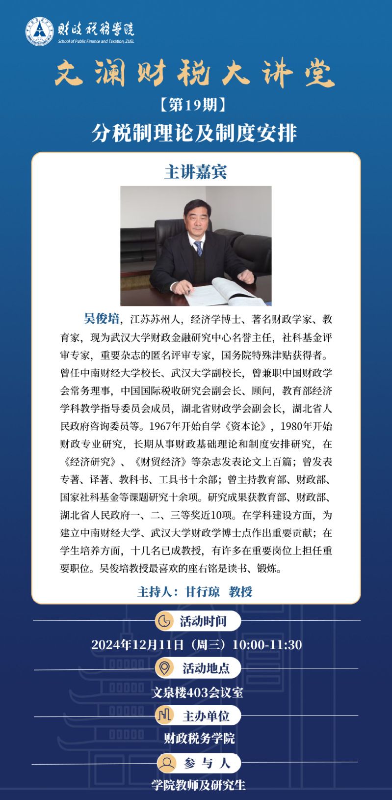 文澜足球比分球探大讲堂(第19期):武汉大学财政金融研究中心主任吴俊培教授