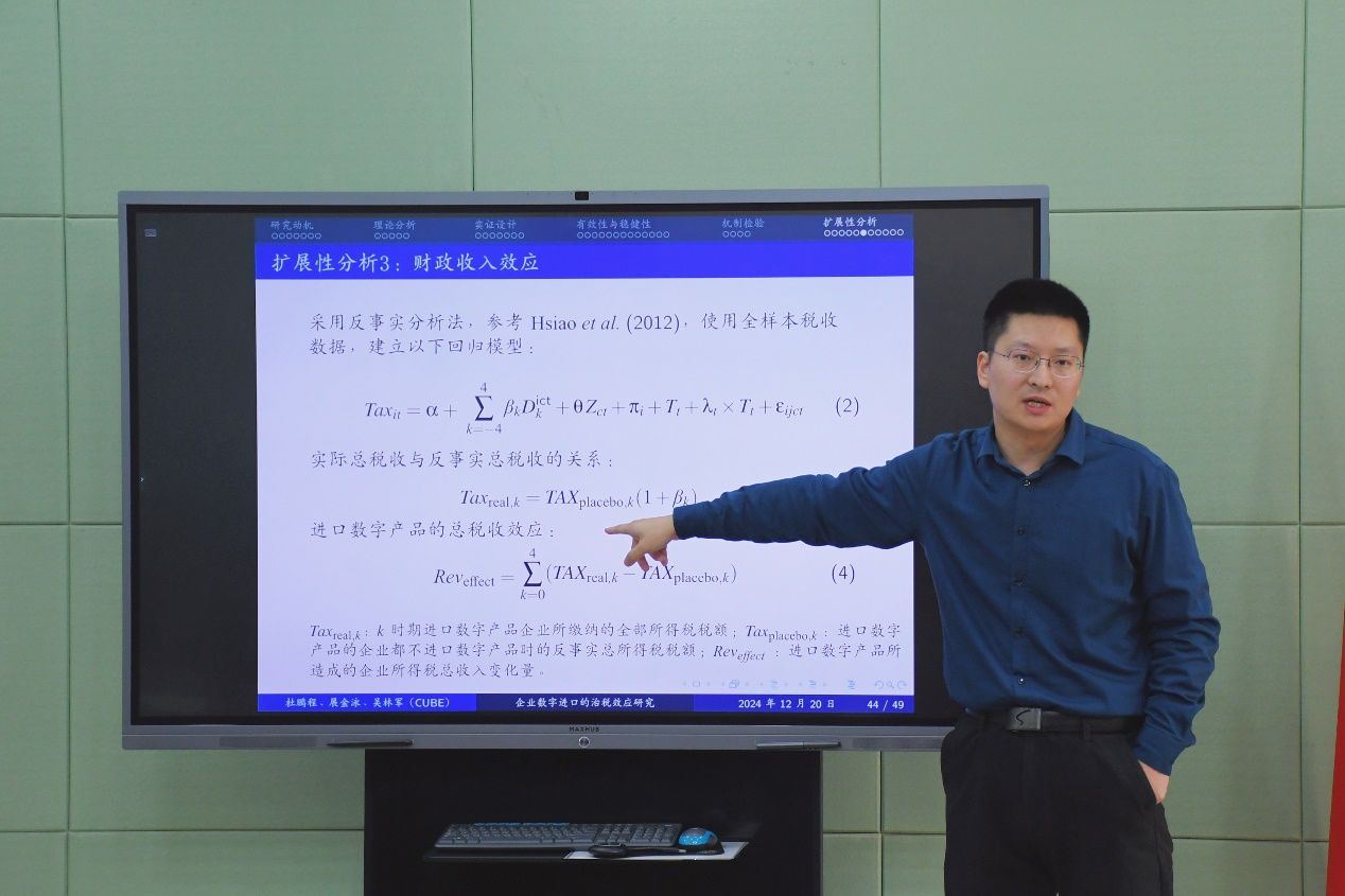 随后,杜鹏程老师深入讲解了论文的研究内容与成果。文章使用了DID分析方法,通过海关数据与企业税收数据匹配研究以及事件分析法和宏观模拟方法,来探讨数字化转型与税收之间的内在关联。研究结论表明,一是企业使用进口数字产品对其所得税纳税遵从度具有显著的提升作用。从影响机制来看,这一过程能够提高企业的生产效率与生产规模,从而强化税收征管;二是有助于提升价格加成和税前利润,进而激发企业纳税的主动性,还能增强资产折旧和产业补贴,有效缓解企业的财务约束。三是进一步分析发现,其 “财政收入效应” 有利于促进财政的可持续发展,“收入分配效应” 则对稳就业以及提高劳动福利有着积极贡献;四是这种促进效应更多体现在征税压力小的和数字基础设施水平高的地区,以及资产密集度高、机器人渗透率高的行业,并且资产规模较小、进口信息技术与设备较多的企业中体现得更为明显。