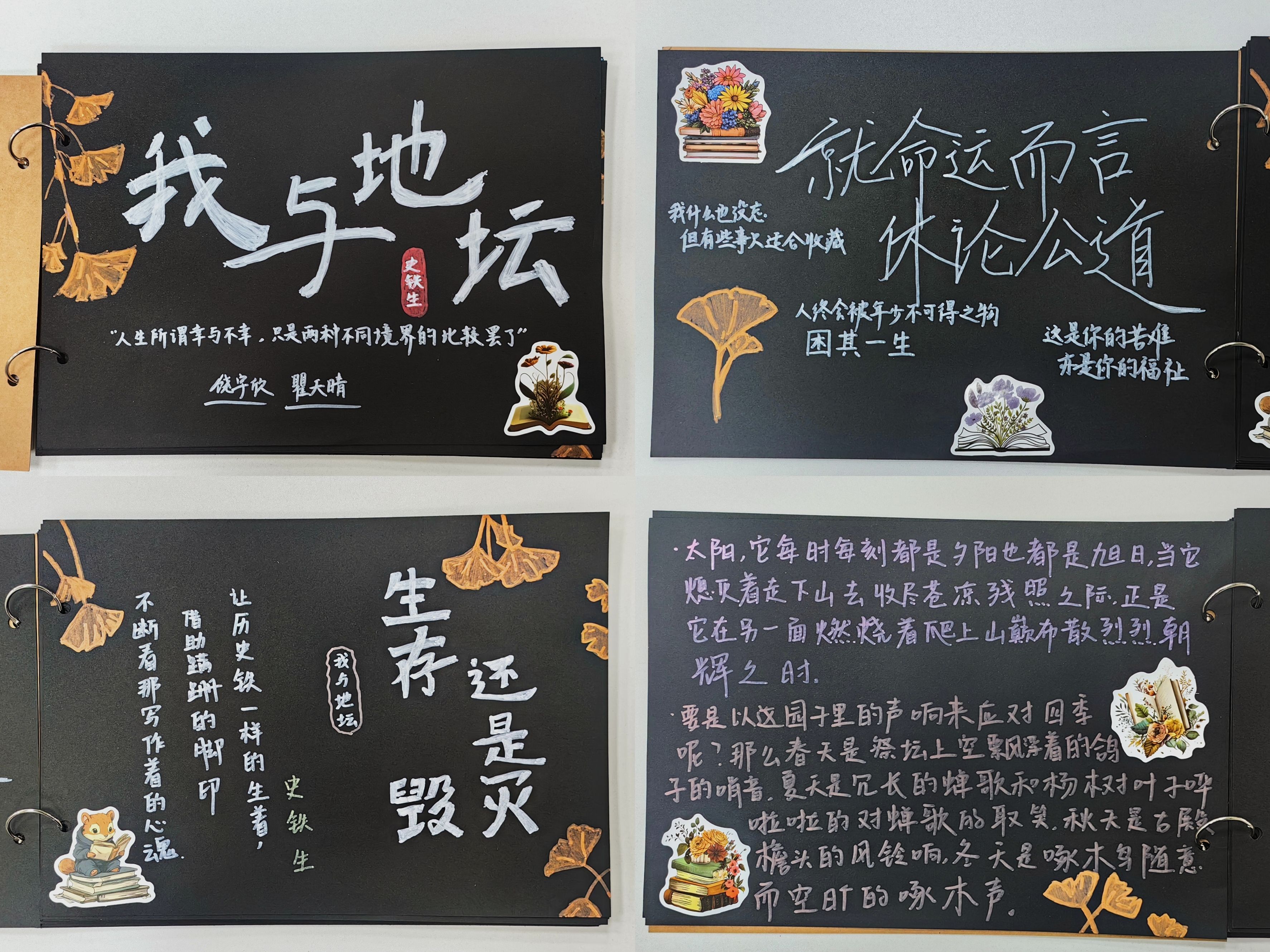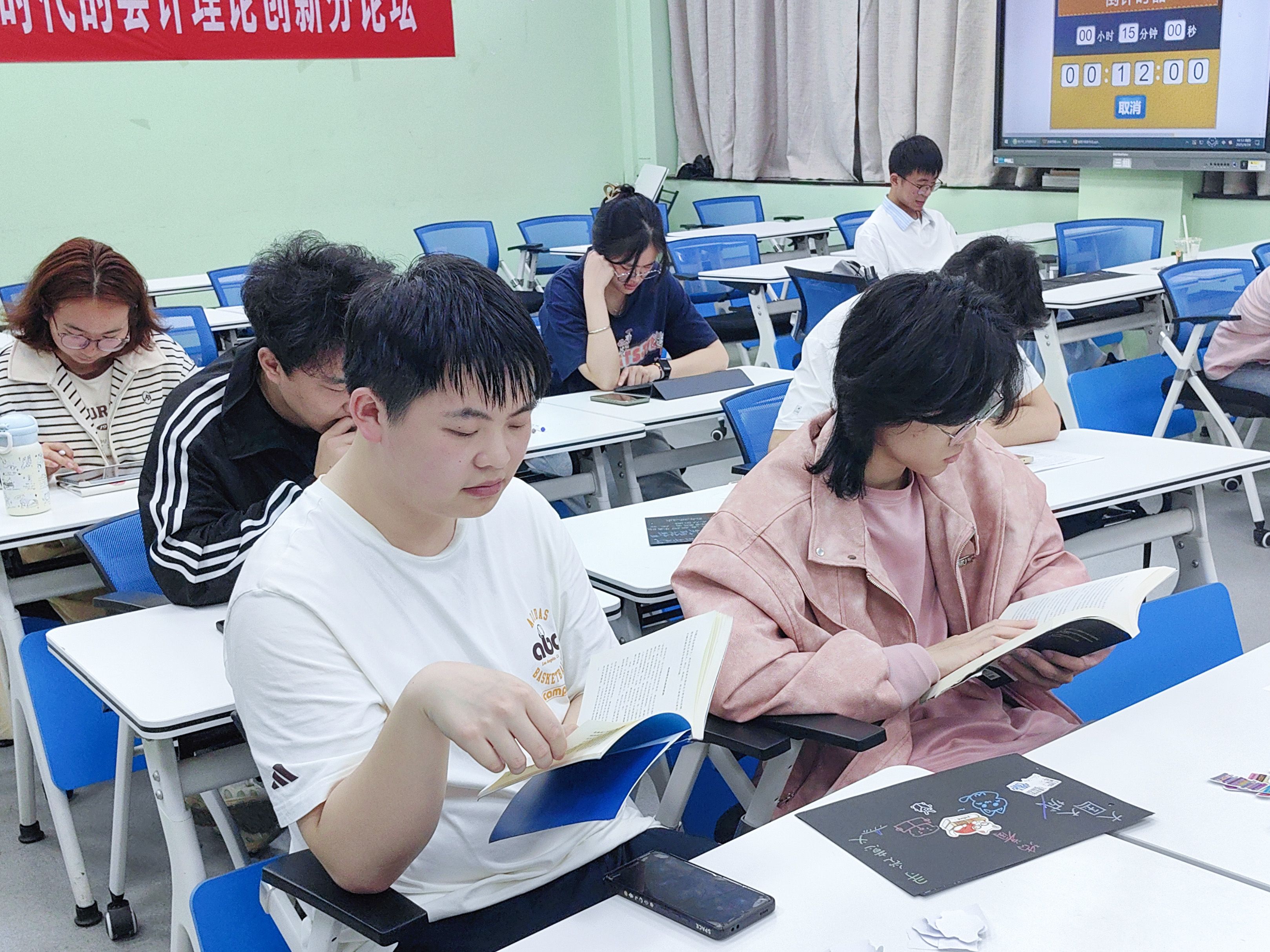 财政2404班拓展活动形式,现场改编演绎经典书籍片段,将读书分享融入知识竞赛、短剧展示、读书手账展评等创意活动中,带给同学们丰富、自由的阅读体验。财政2301班带领同学们共同体验“15分钟沉浸阅读”,精心设计读书手账,将阅读的感悟化作斑斓画卷,装订成册后形成班级“阅读记忆库”,加强阅读创意成果宣传与推广。国财2301班设置emoji猜书名、春日荐书、手绘书签制作等活动,将文学作品中的春日浪漫跃然纸上,让同学们在沉浸式互动体验中享受阅读乐趣。