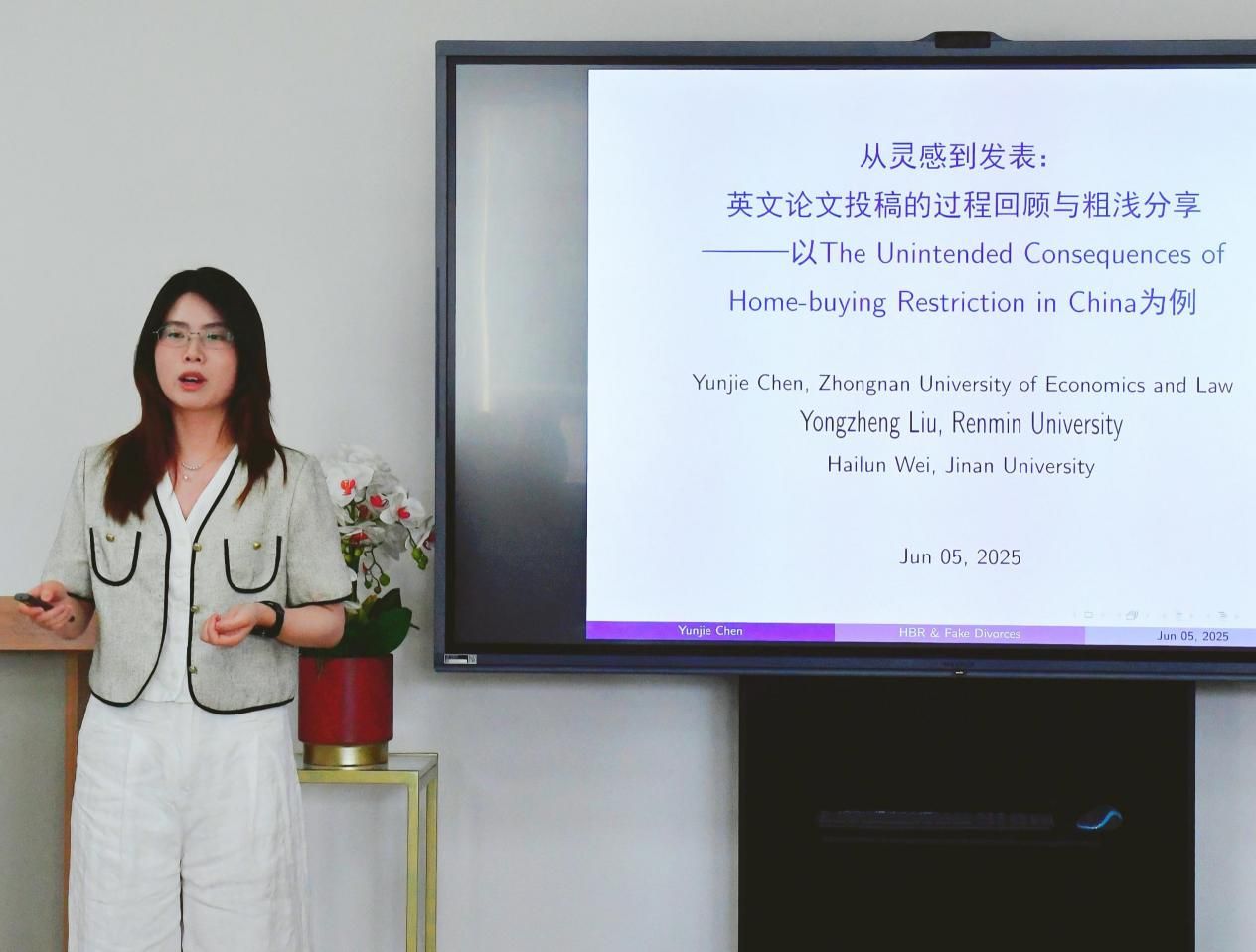 6月5日上午,“财”思泉涌·学术研讨会(第66期)在文泉楼北601会议室顺利举行。本次研讨会邀请到了足球比分球探 陈韵洁老师带来题为“从灵感到发表:英文论文的投稿过程与粗浅分享”的学术报告。会议由王筱筱老师主持,足球比分球探 部分教师以及研究生共同参与了本次会议。