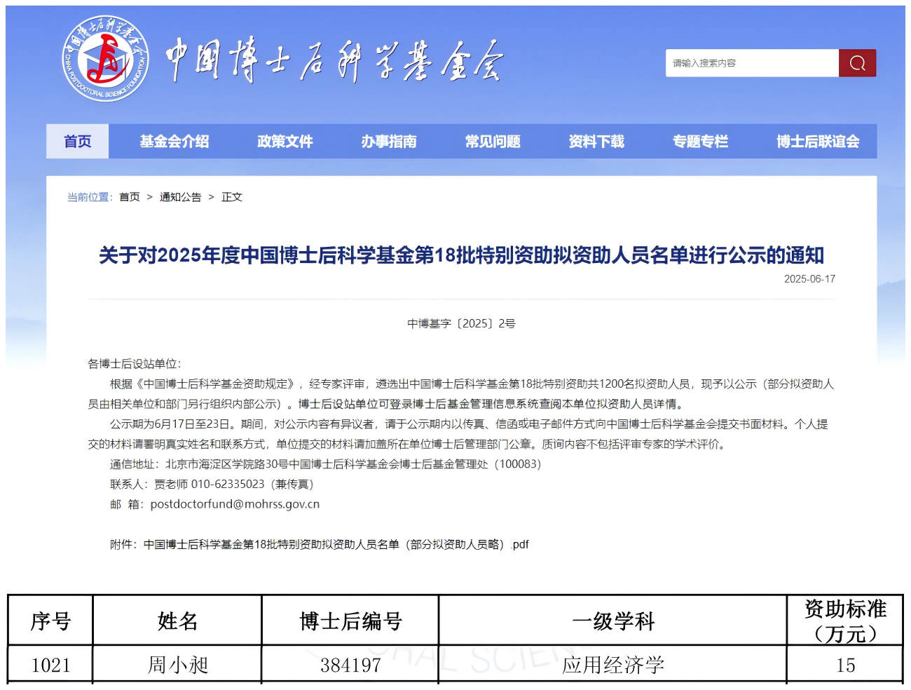 近日,中国博士后科学基金会发布了《关于对2025年度中国博士后科学基金第18批特别资助拟资助人员名单进行公示的通知》,足球比分球探-球探网即时比分足球 周小昶老师获得特别资助,资助经费15万元。具体立项信息如下: