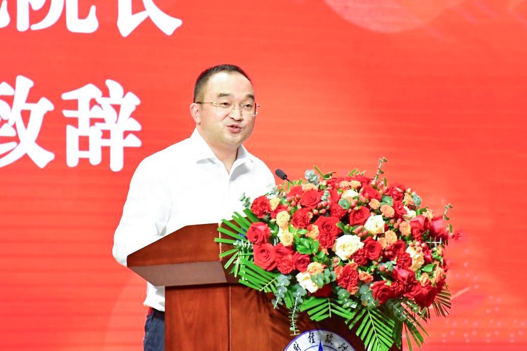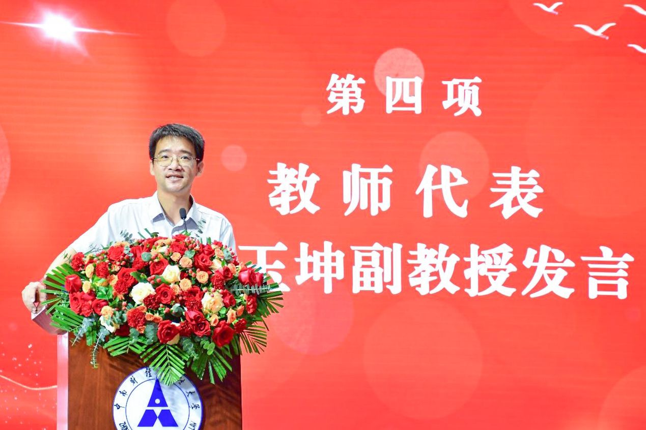 孙玉坤副教授作为教师代表上台发言。他结合自身教学感悟与校友经验,为新生送上三点成长指引:一是“把知识连到世界”,以财政学理论关联社会实际,以服务公共利益为目标;二是“与时间做朋友”,珍惜大学时光,通过社会实践、校园活动等提升能力、拓宽视野,同时合理规划时间,兼顾学业实践与生活体验;三是“在思考中形成选择”,坚持多读书、勤思考,以理性判断指导行动,对未来发展路径无需急于确定,可在学习实践中逐步完善规划。