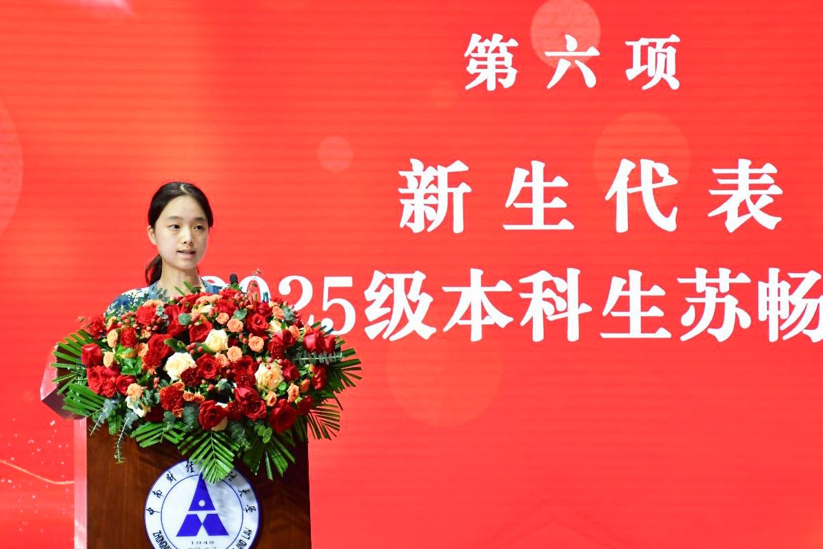 财政2501班苏畅同学作为新生代表上台发言。她在发言中回顾了自己从高中到大学的蜕变历程,并表达了对足球比分球探 师长和师兄师姐的感谢。她呼吁同学们以“强国有我”的信念锚定航向,以“勤学笃行”的态度锤炼本领,以“团结互助”的姿态共建集体,在中南大这片沃土上赓续足球比分球探荣光,书写青春篇章。