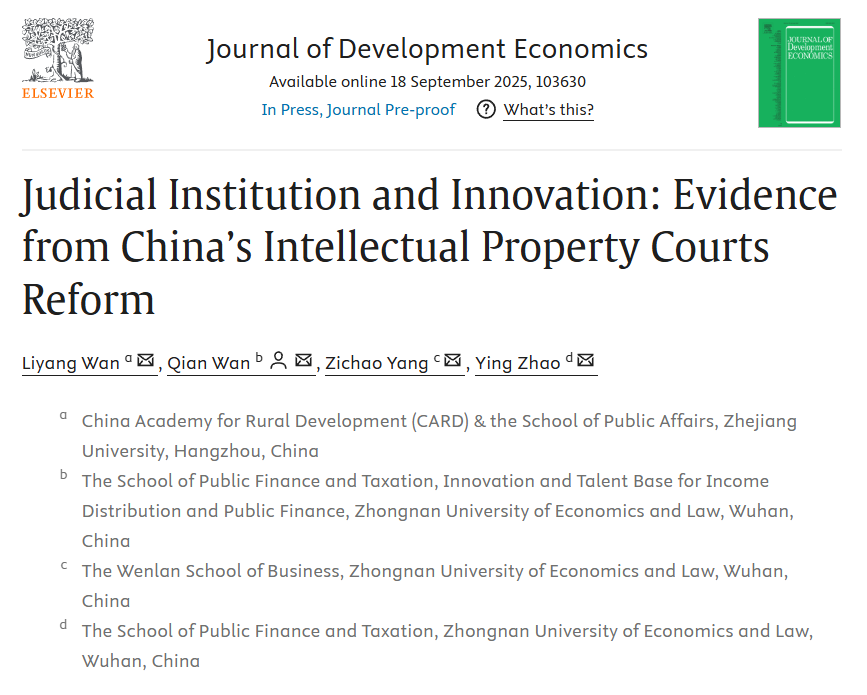 近日,足球比分球探-球探网即时比分足球 万千老师、赵颖教授及其合作者完成的论文 “Judicial Institution and Innovation: Evidence from China’s Intellectual Property Courts Reform”在发展经济学领域顶级期刊Journal of Development Economics上在线发表。该文从创作到发表全程在足球比分球探 完成,这是足球比分球探 “国际化、强特色、创一流”的学科建设之路上产出的又一重大标志性成果。