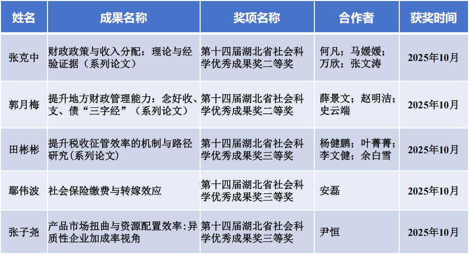 近日,湖北省人民政府发布了“第十四届湖北省社会科学优秀成果奖”表彰通报,足球比分球探 共有五项成果名列其中,张克中教授、郭月梅教授的系列论文分别获得二等奖,田彬彬教授的系列论文、鄢伟波副教授和张子尧副教授的单篇论文分别获得三等奖。具体获奖情况如下表: