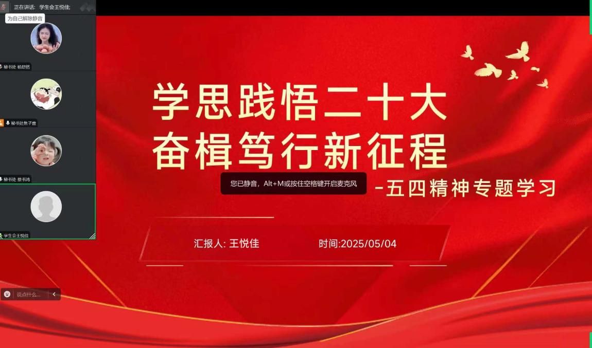 学习会上,王悦佳同学带领与会成员回顾了五四运动的光辉历程,深入阐释了以“爱国、进步、民主、科学”为核心的五四精神的历史意义与时代价值,引导学生会成员深刻领会党对新时代青年提出的“有理想、敢担当、能吃苦、肯奋斗”的殷切期望,勇担时代重任,在服务同学中贡献青春力量。此次专项学习会既深化了学生会干部对五四精神的理解,更激发了大家的爱国热情与专业使命感。
